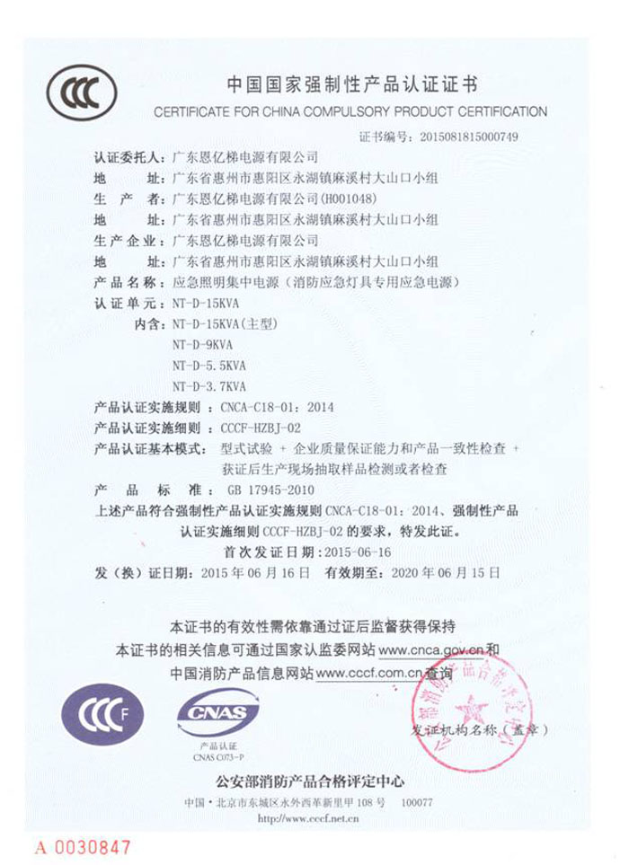 中國(guó)國(guó)家強(qiáng)制性產(chǎn)品認(rèn)證(消防應(yīng)急燈具專用應(yīng)急電源)
