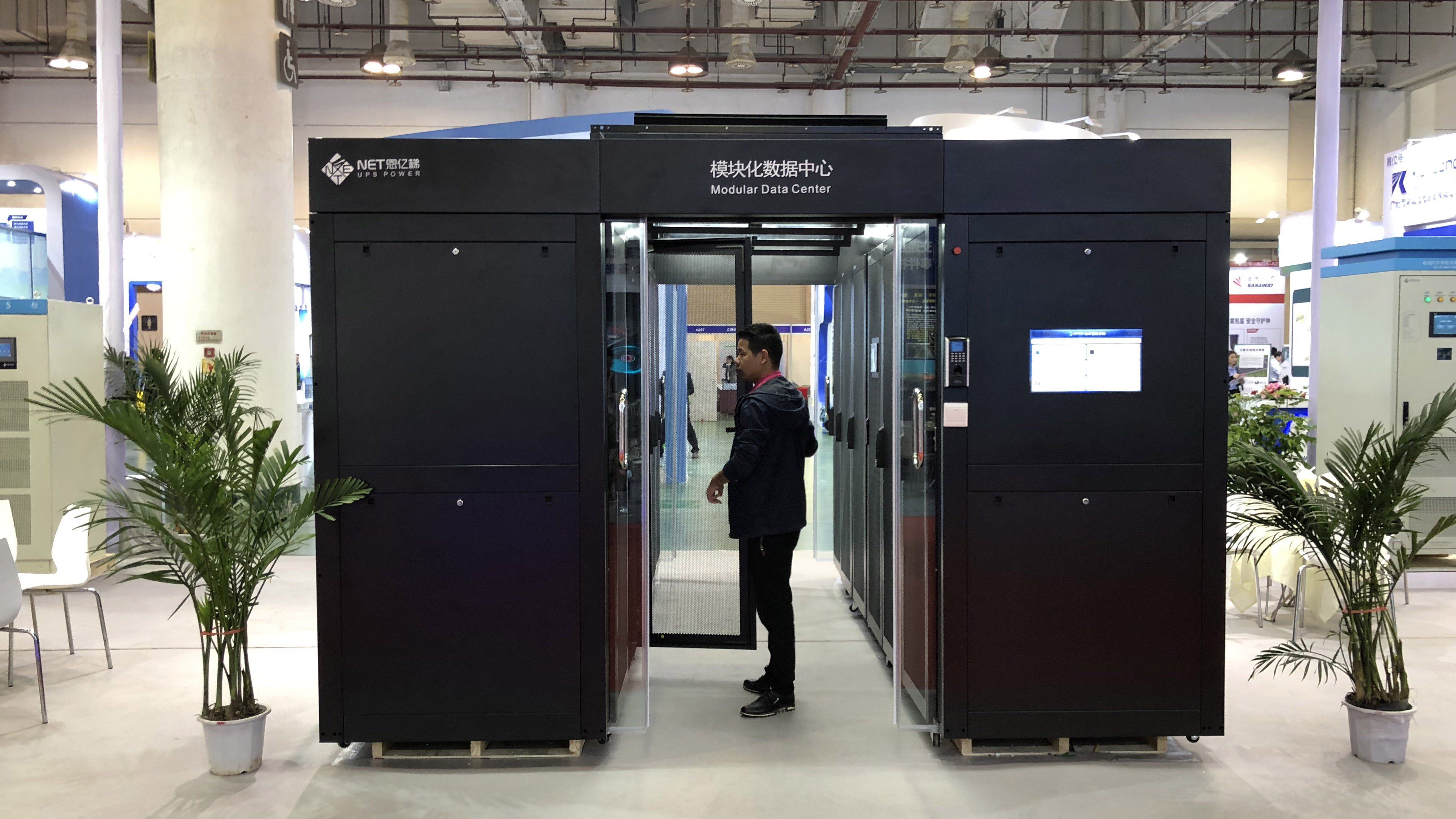工作人員向客戶介紹模塊化數(shù)據(jù)中心的應(yīng)用領(lǐng)域